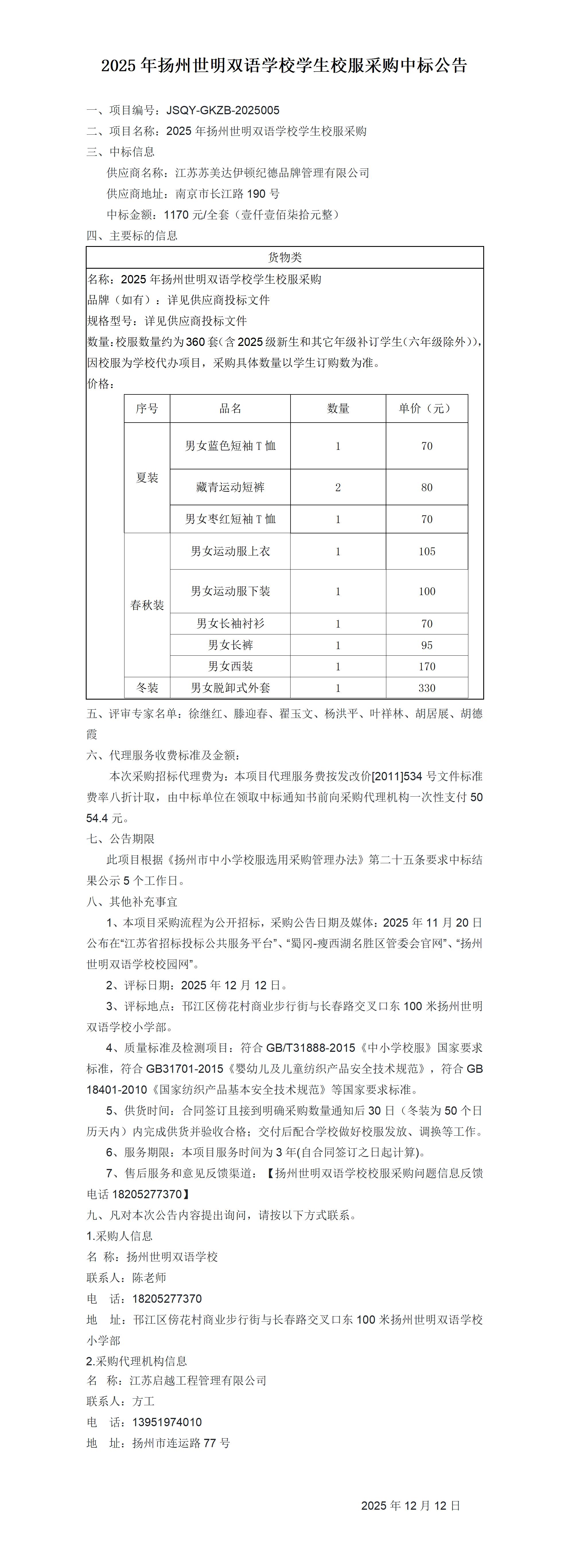 2025年揚州世明雙語學(xué)校學(xué)生校服采購中標(biāo)公告